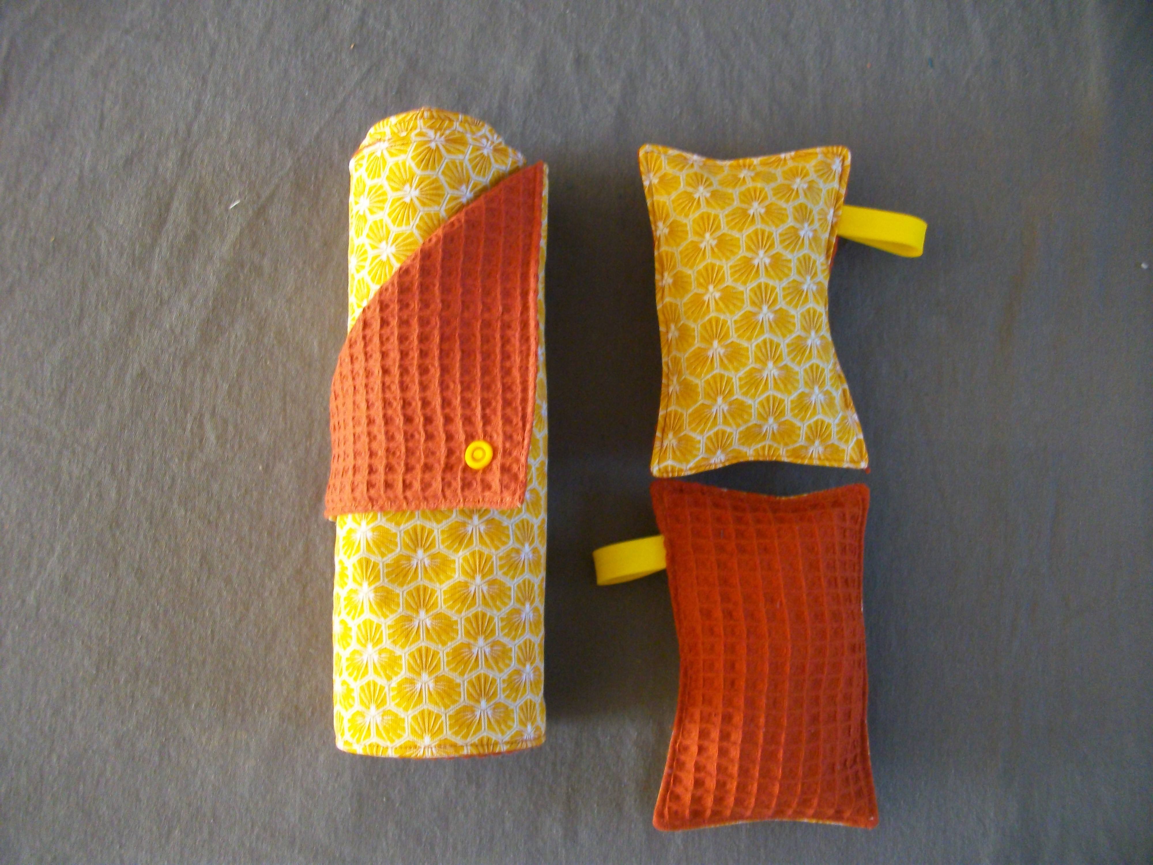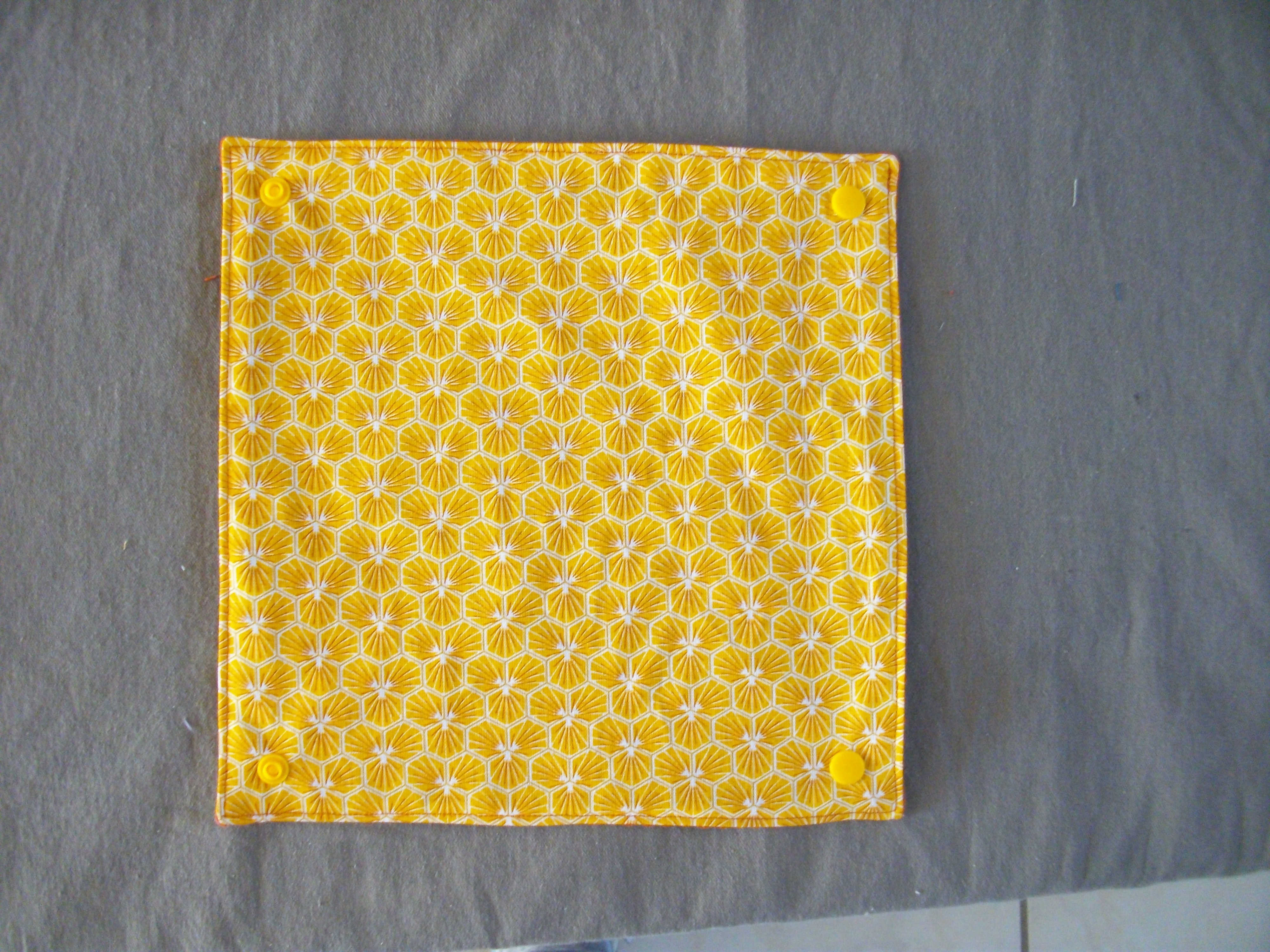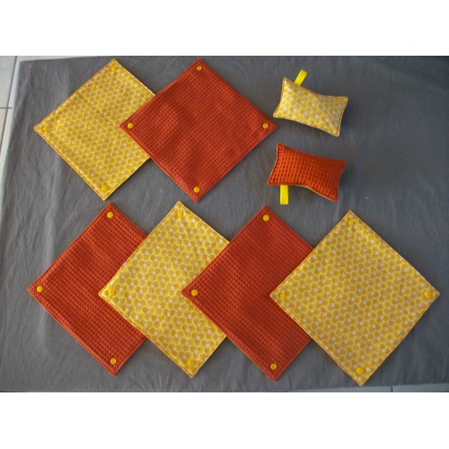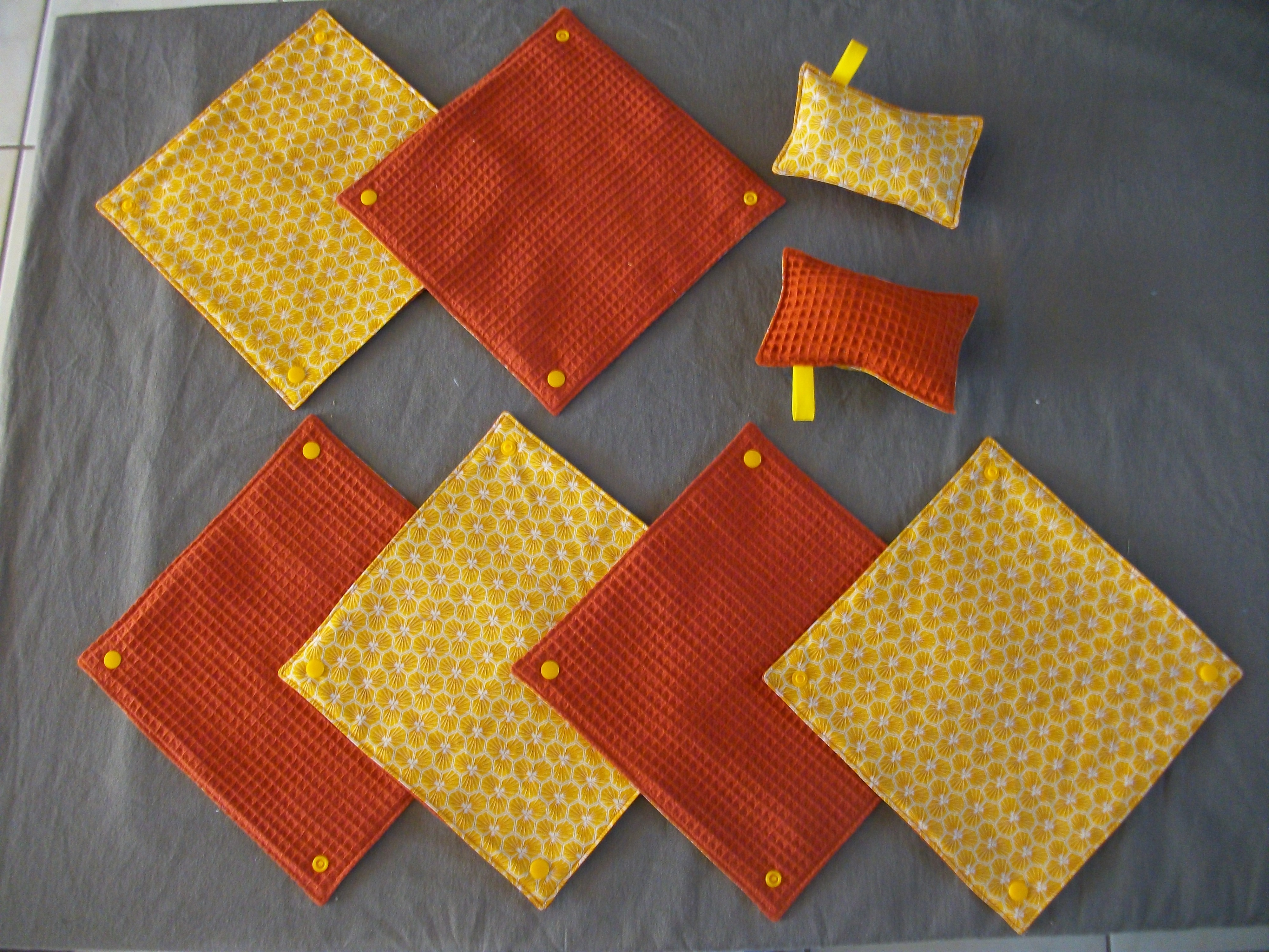 Neuf, fait main, ensemble de 6 essuies tout lavable et réutilisable, dimension : 23,5 x 23,5 cm. ils sont attachés ensemble par un système de pressions plastiques. Une face 100% coton, un face éponge nid d'abeille ( léger, très absorbant et résistant) . Deux éponges coordonnées (rembourrage en tissu coton) dimension : 9x13,5 cm, très pratique pour essuyer la table, nettoyer la salle de bain car non abrasif, respect les surfaces fragiles, elles sont lavables et réutilisables.