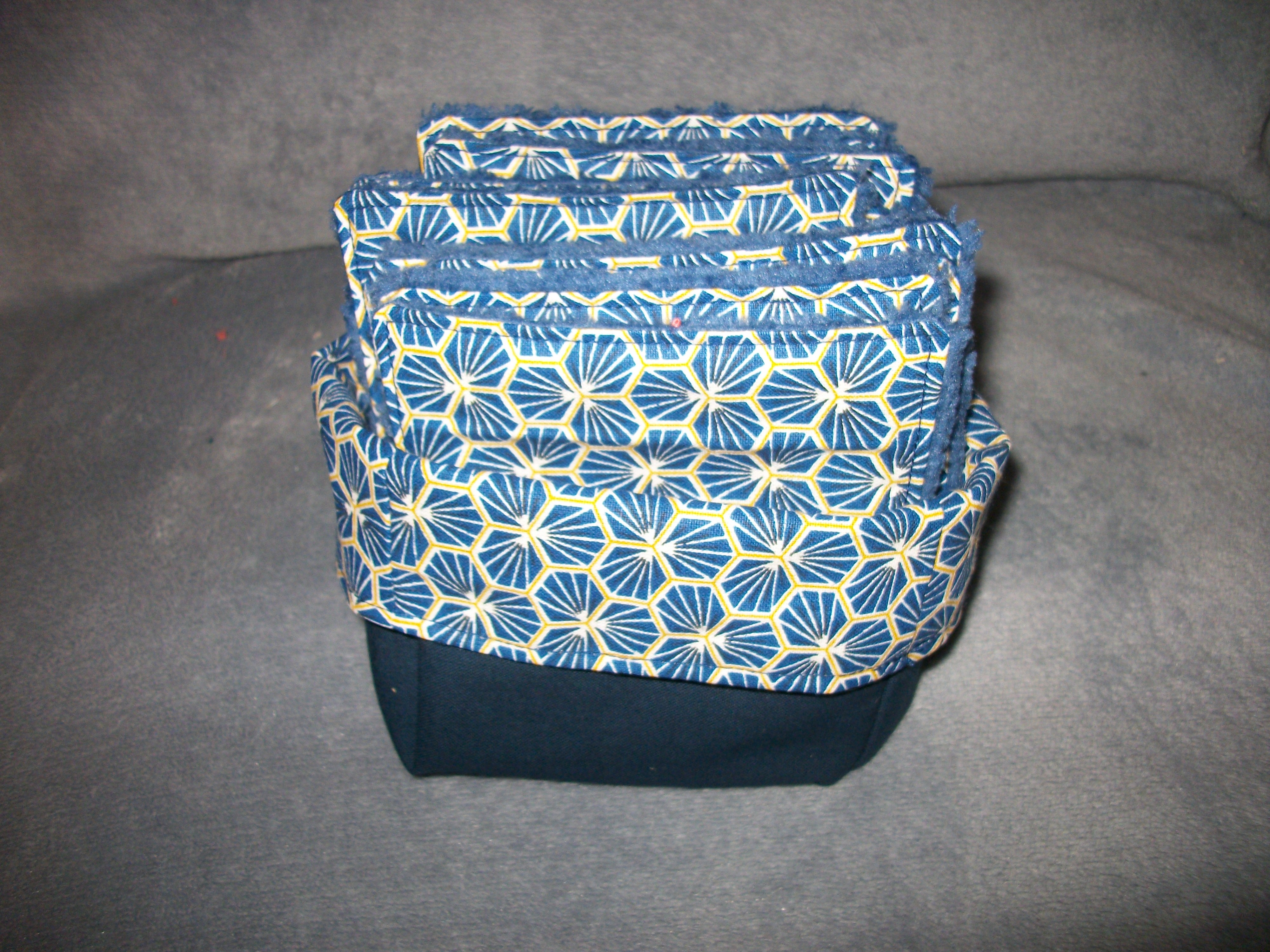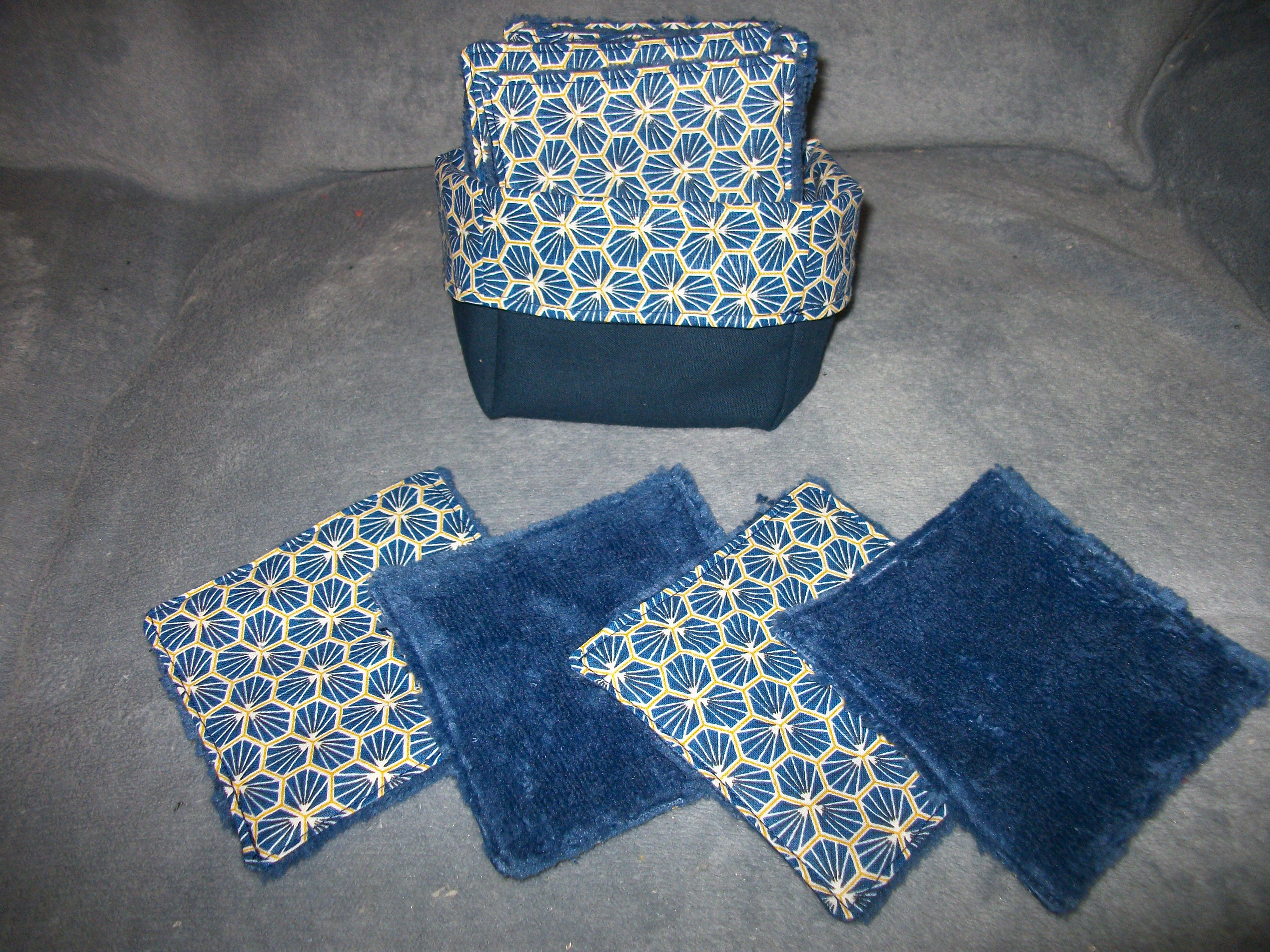 Neuf, fait main , ensemble panier + 14 carrés de coton démaquillant (10x10cm). Une face tissu coton OEKO-TEX, une face tissu éponge bambou. Ecologique : zéro déchets, Economique : lavable et passe au sèche linge