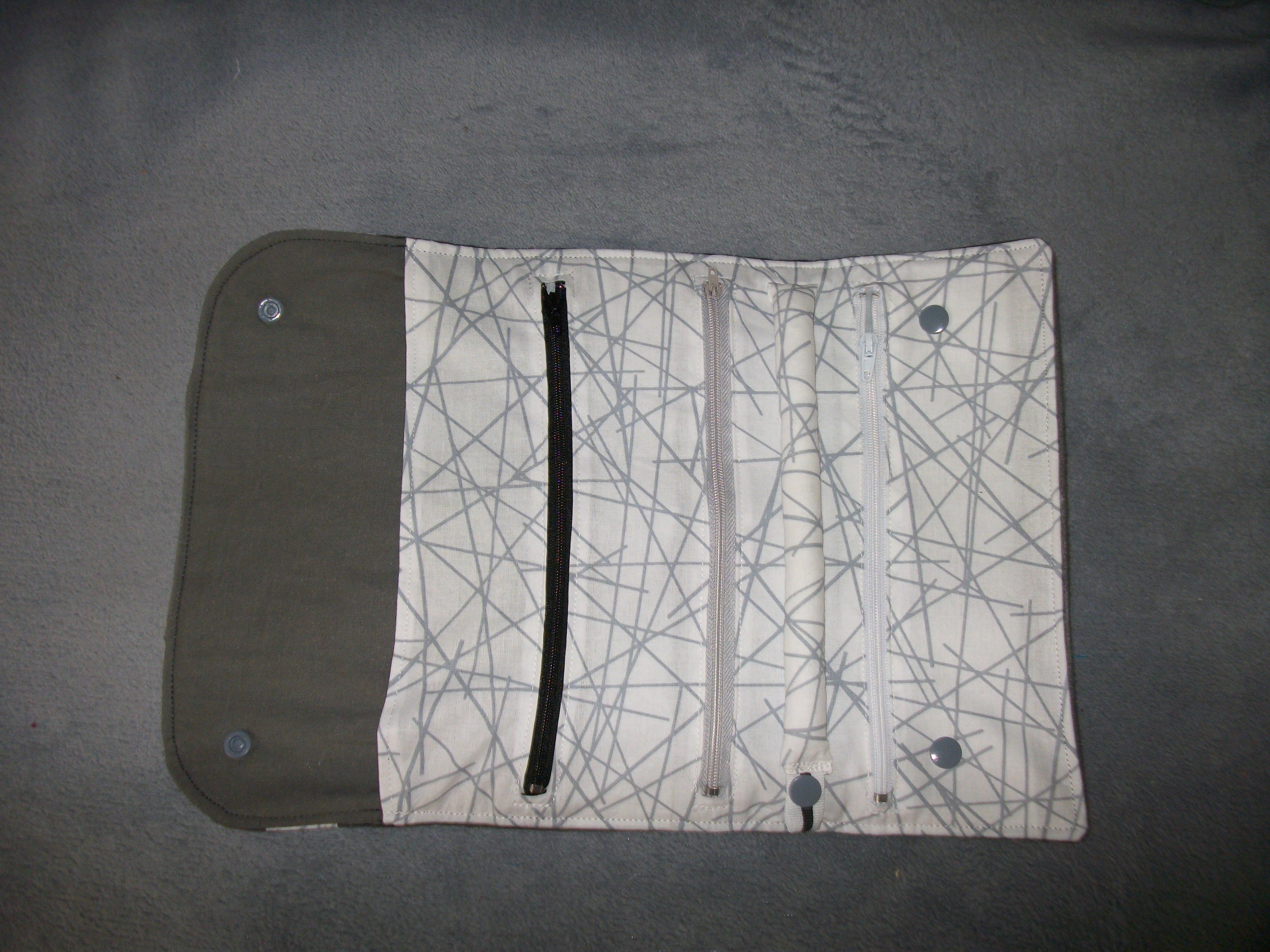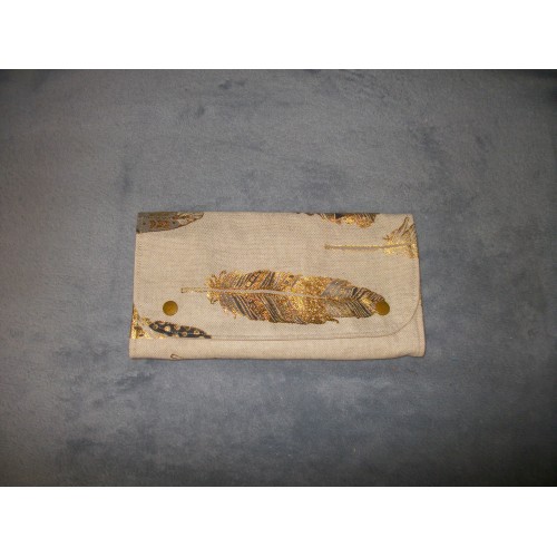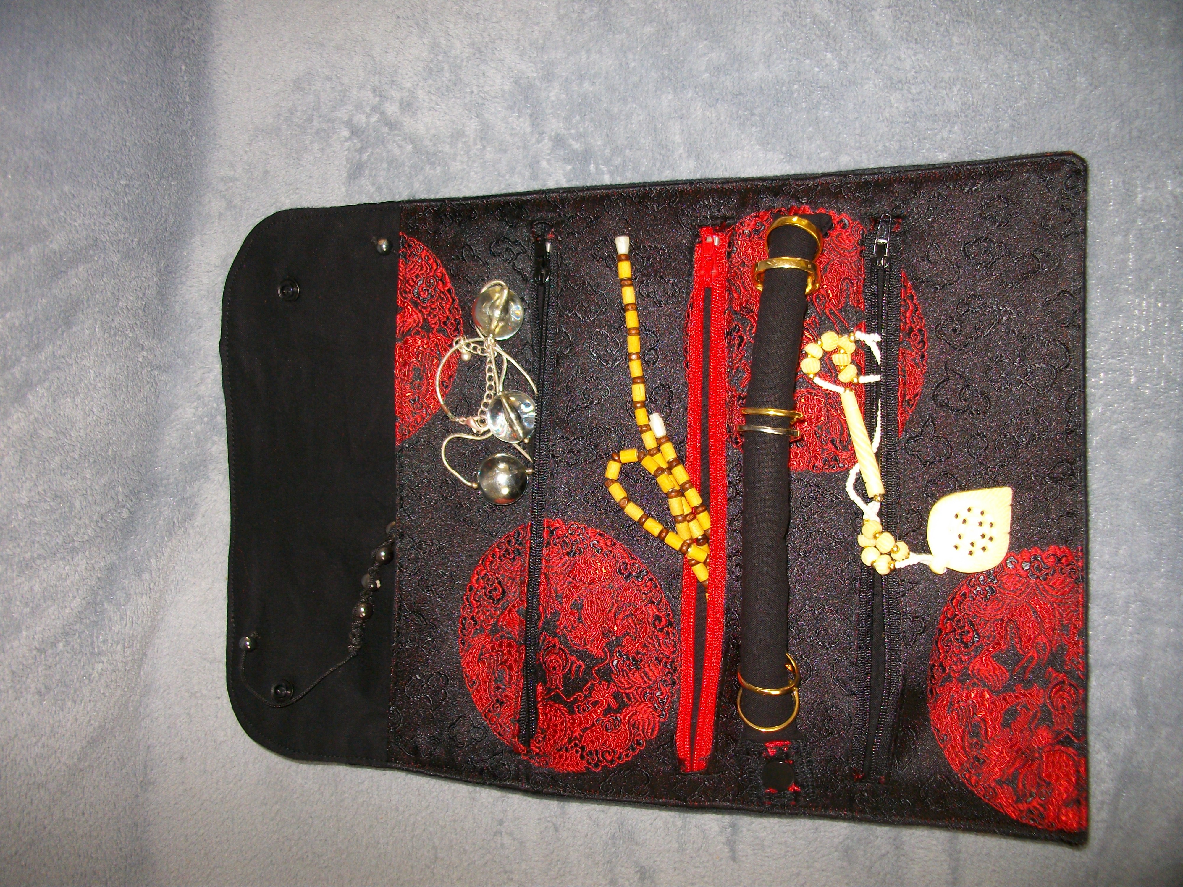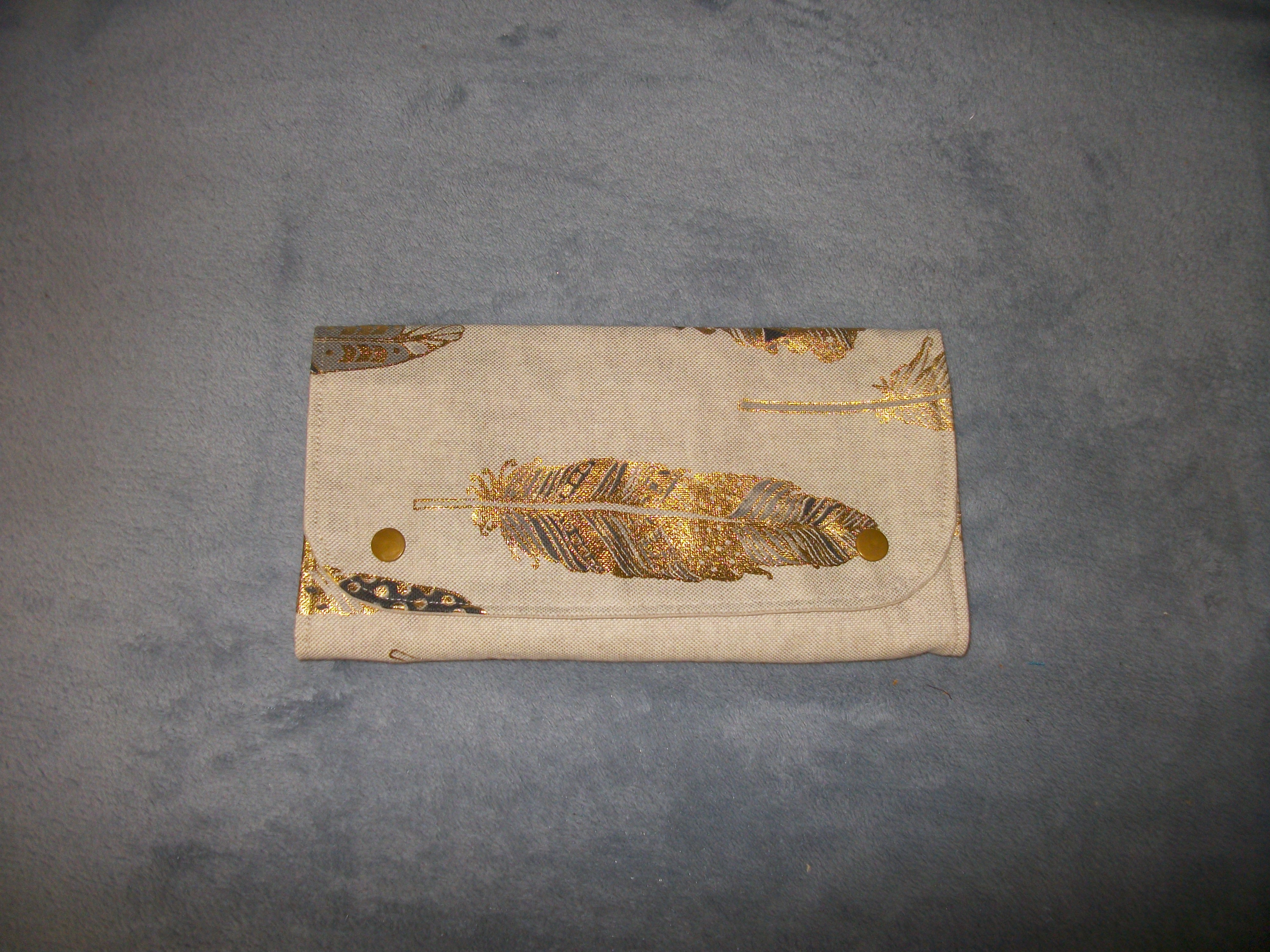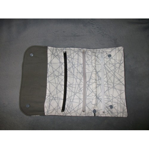 Neuf, fait main, pochette à bijoux (12x 23,5 cm en forme portefeuille; 34,5x23,5 cm une fois dépliée). Face extérieure en tissu peau de pêche (imitation daim), intérieur en coton OEKO-TEX. Comprend 3 compartiments avec fermeture éclair et un baguier fermeture par pressions, une grande pochette derrière les pochettes à fermetures éclaires.