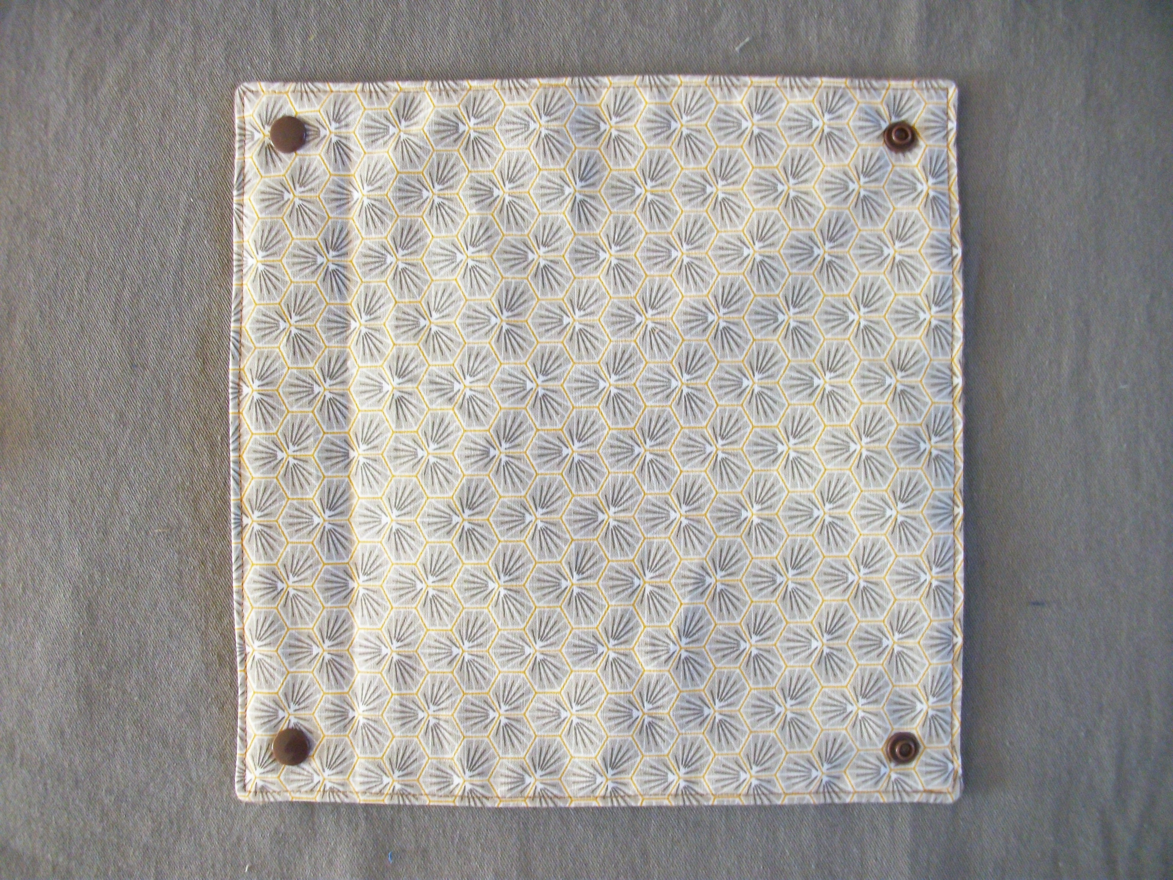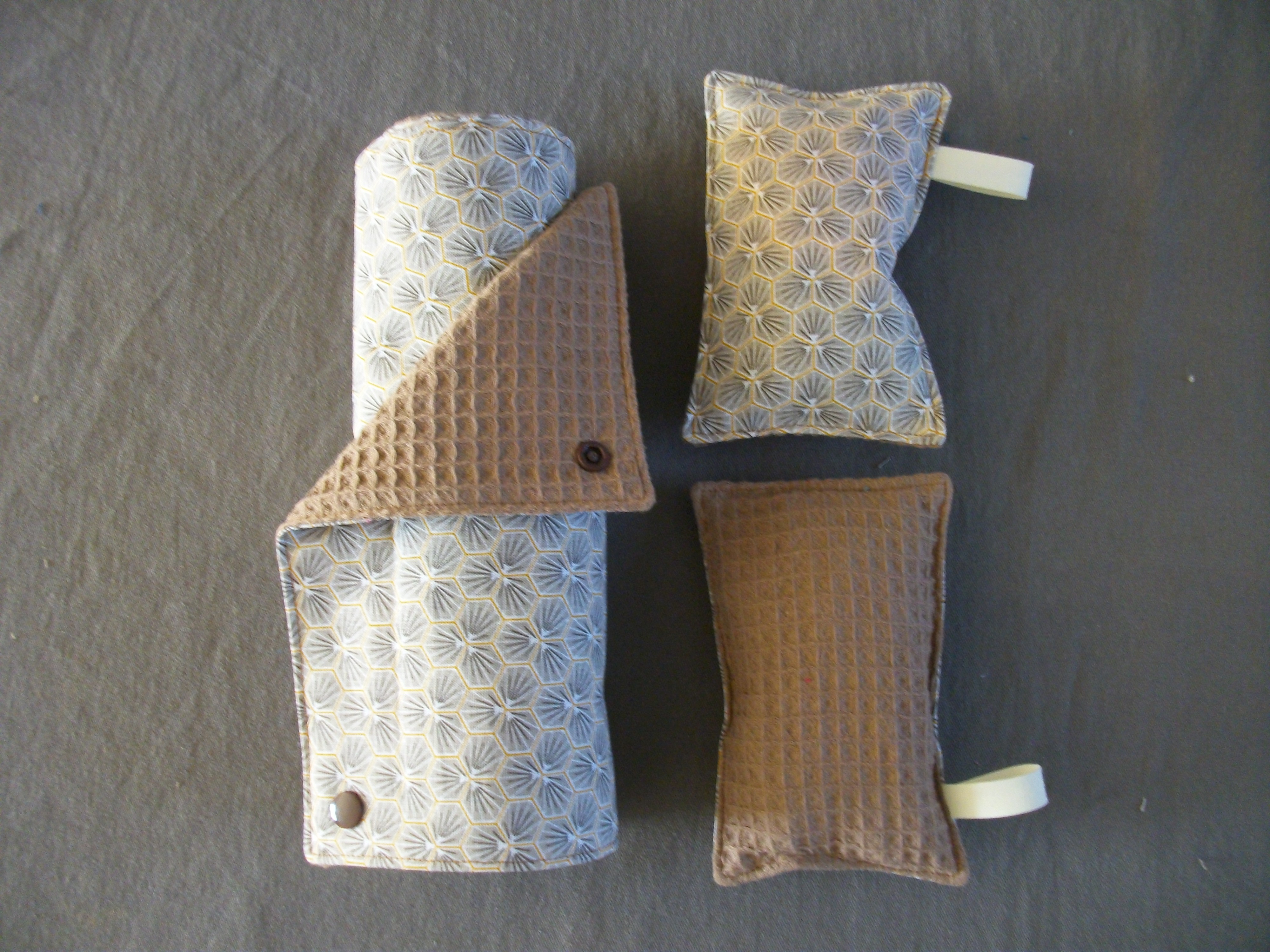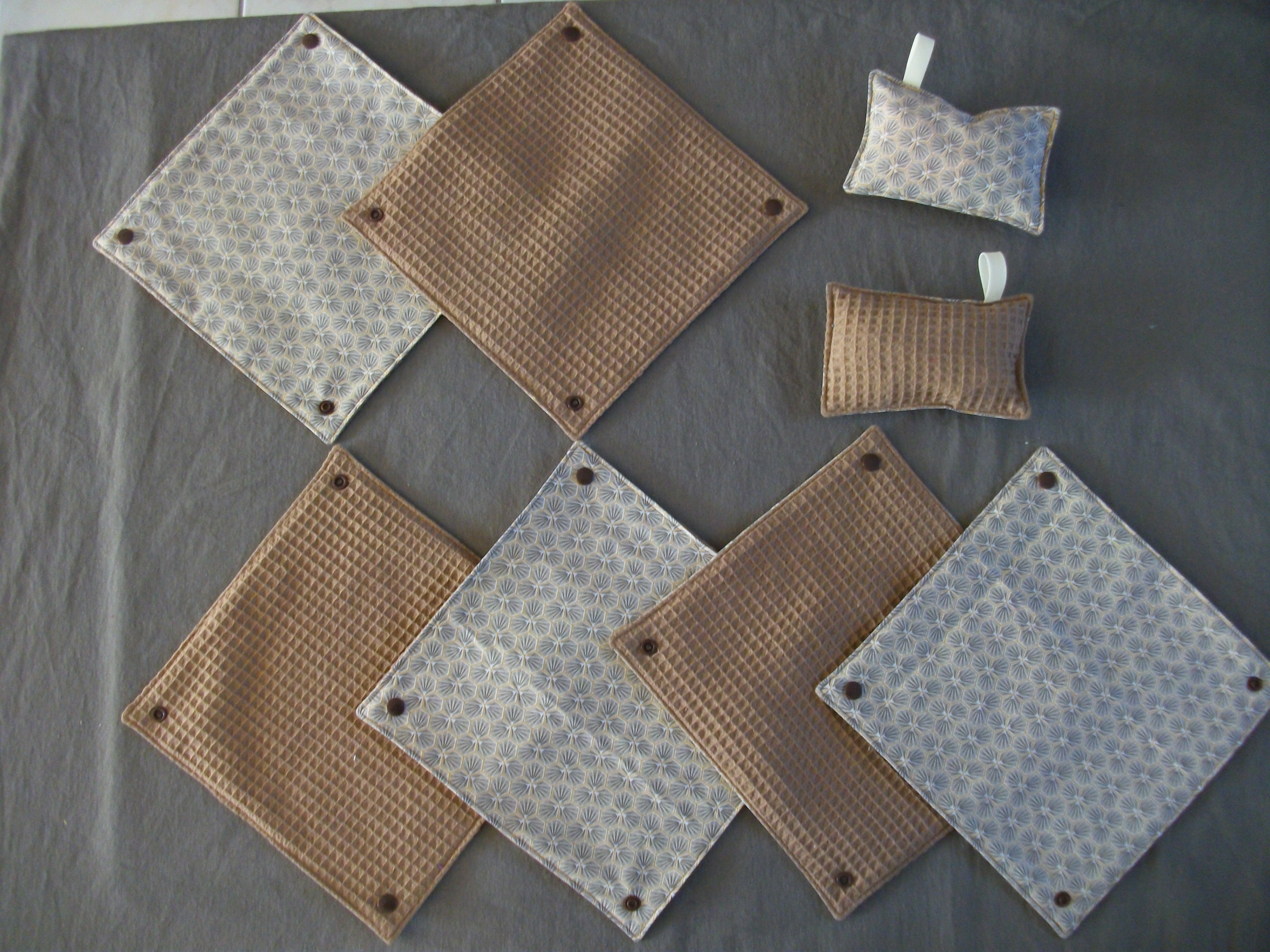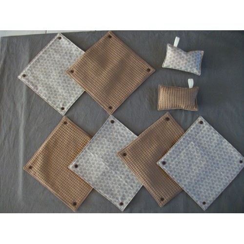 Neuf, fait main, ensemble de 6 essuies tout lavable et réutilisable, dimension : 23,5 x 23,5 cm. ils sont attachés ensemble par un système de pressions plastiques. Une face 100% coton, un face éponge nid d'abeille ( léger, très absorbant et résistant) . Deux éponges coordonnées (rembourrage en tissu coton) dimension : 9x13,5 cm, très pratique pour essuyer la table, nettoyer la salle de bain car non abrasif, respect les surfaces fragiles, elles sont lavables et réutilisables.