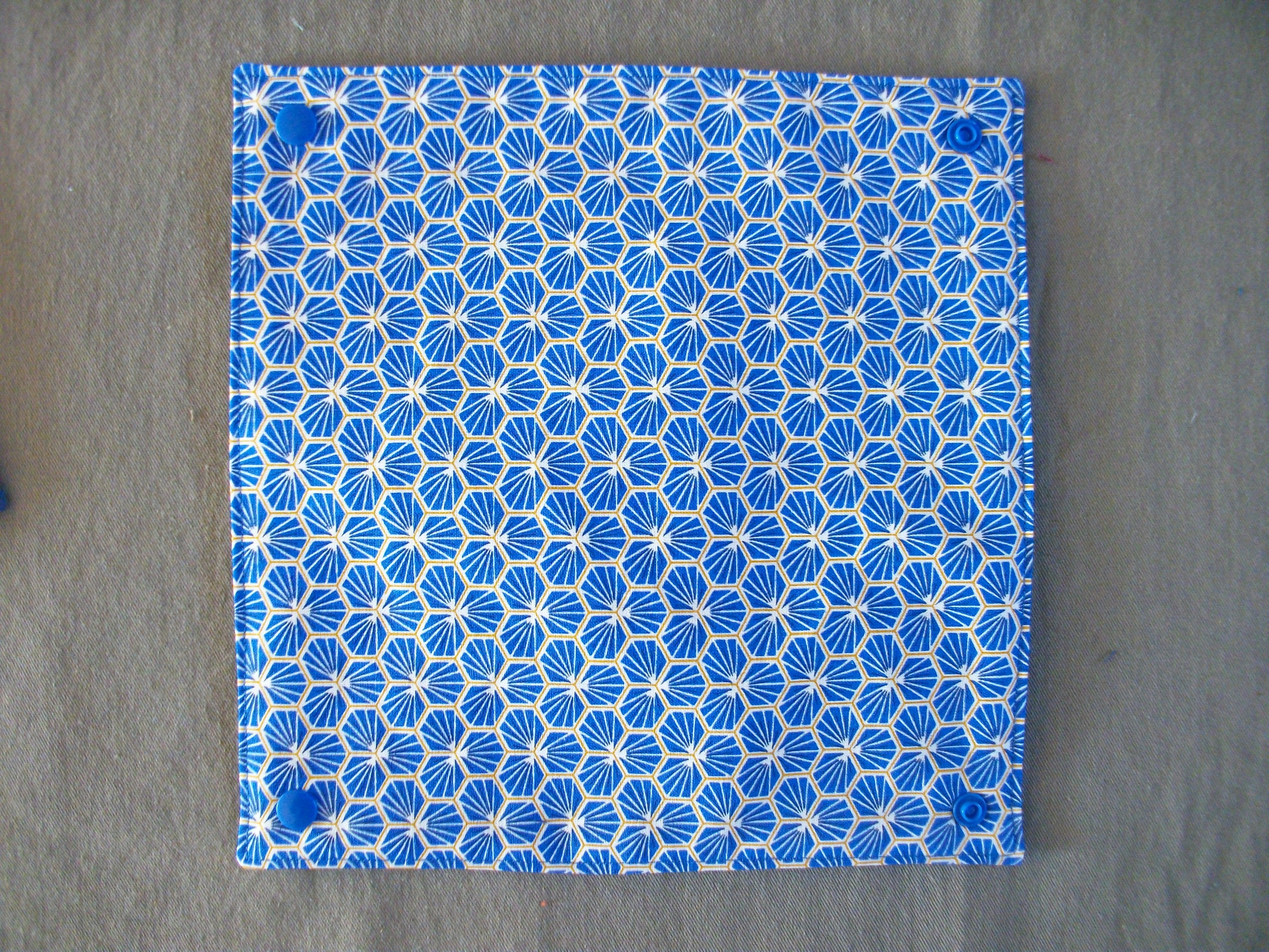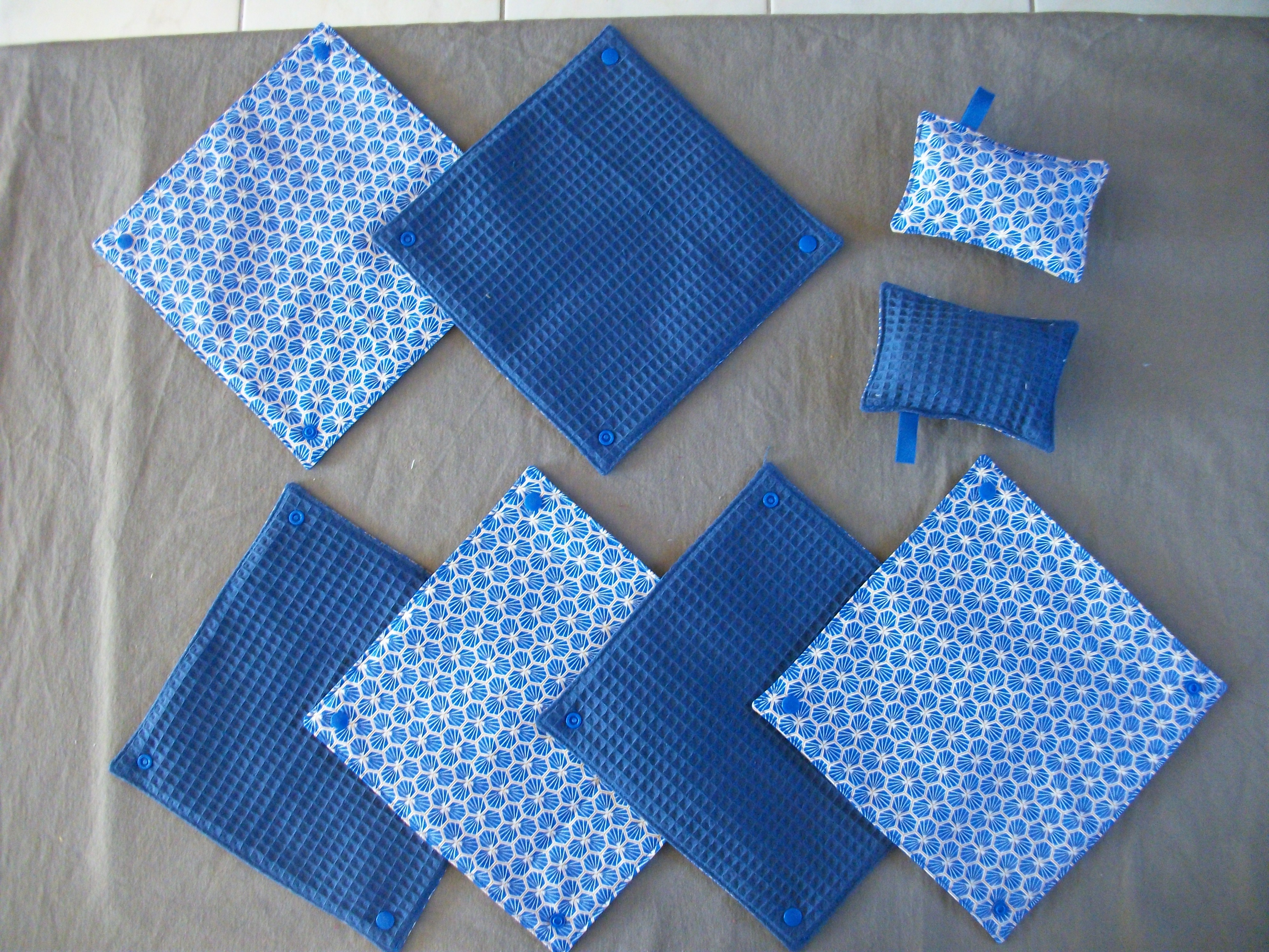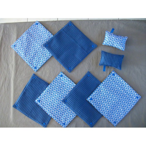 Neuf, fait main, ensemble de 6 essuies tout lavable et réutilisable, dimension : 23,5 x 23,5 cm. ils sont attachés ensemble par un système de pressions plastiques. Une face 100% coton, un face éponge nid d'abeille ( léger, très absorbant et résistant) . Deux éponges coordonnées (rembourrage en tissu coton) dimension : 9x13,5 cm, très pratique pour essuyer la table, nettoyer la salle de bain car non abrasif, respect les surfaces fragiles, elles sont lavables et réutilisables.
