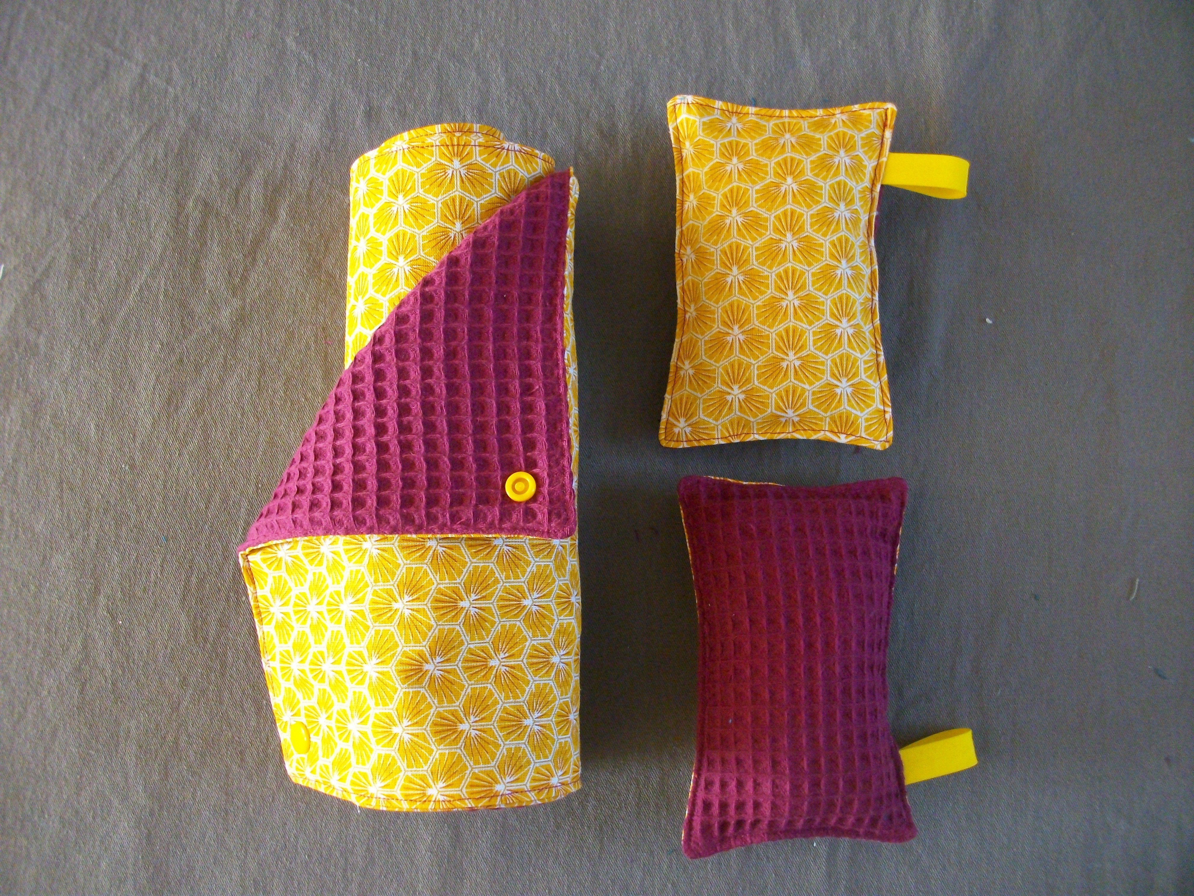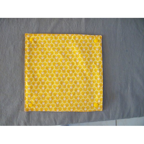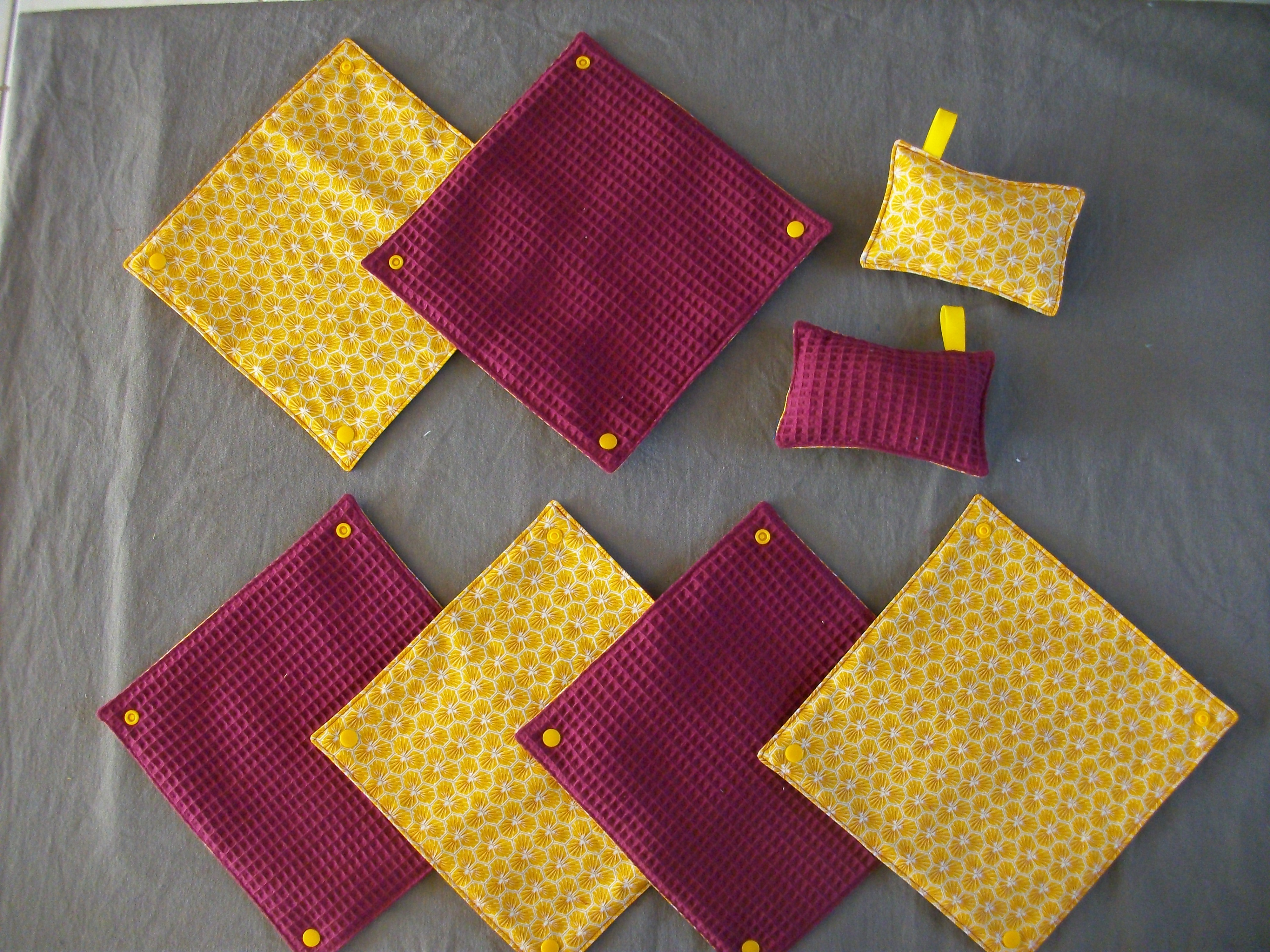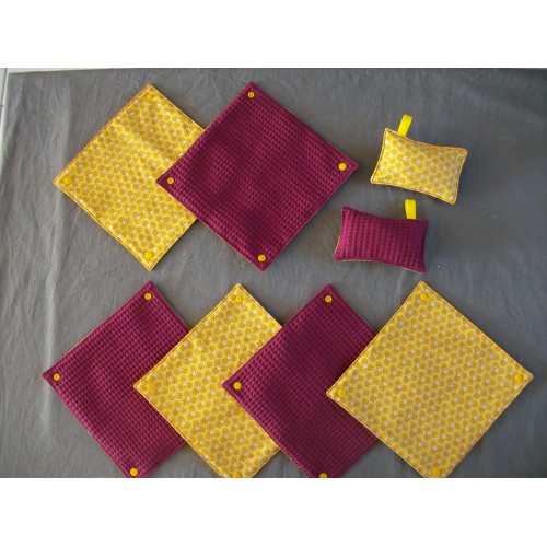 Neuf, fait main, ensemble de 6 essuies tout lavable et réutilisable, dimension : 23,5 x 23,5 cm. ils sont attachés ensemble par un système de pressions plastiques. Une face 100% coton, un face éponge nid d'abeille ( léger, très absorbant et résistant) . Deux éponges coordonnées (rembourrage en tissu coton) dimension : 9x13,5 cm, très pratique pour essuyer la table, nettoyer la salle de bain car non abrasif, respect les surfaces fragiles, elles sont lavables et réutilisables.