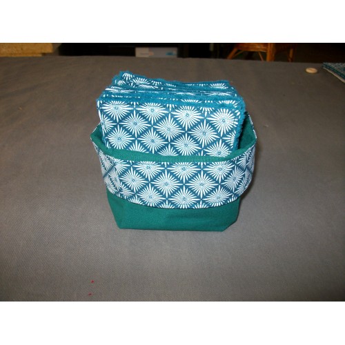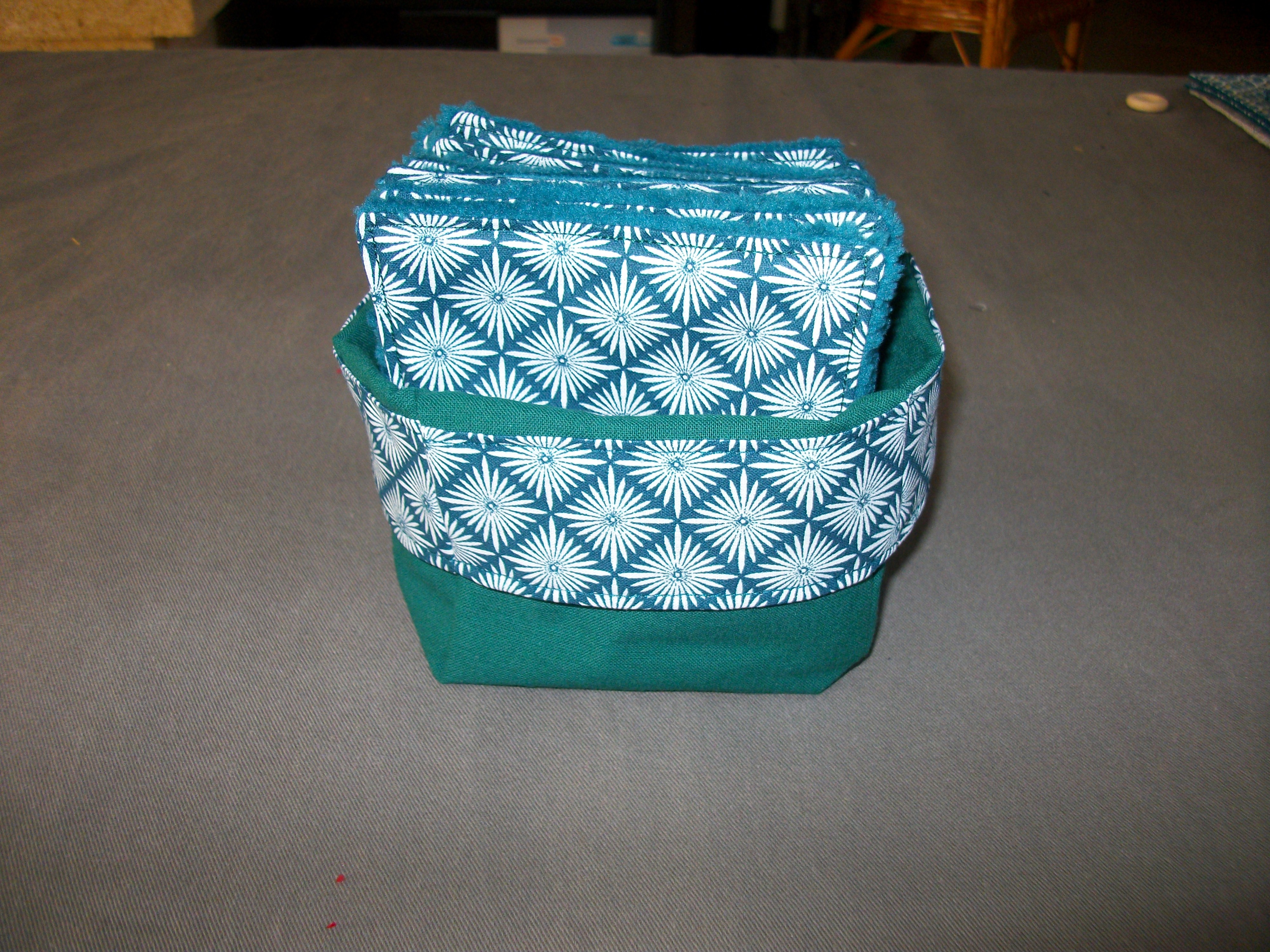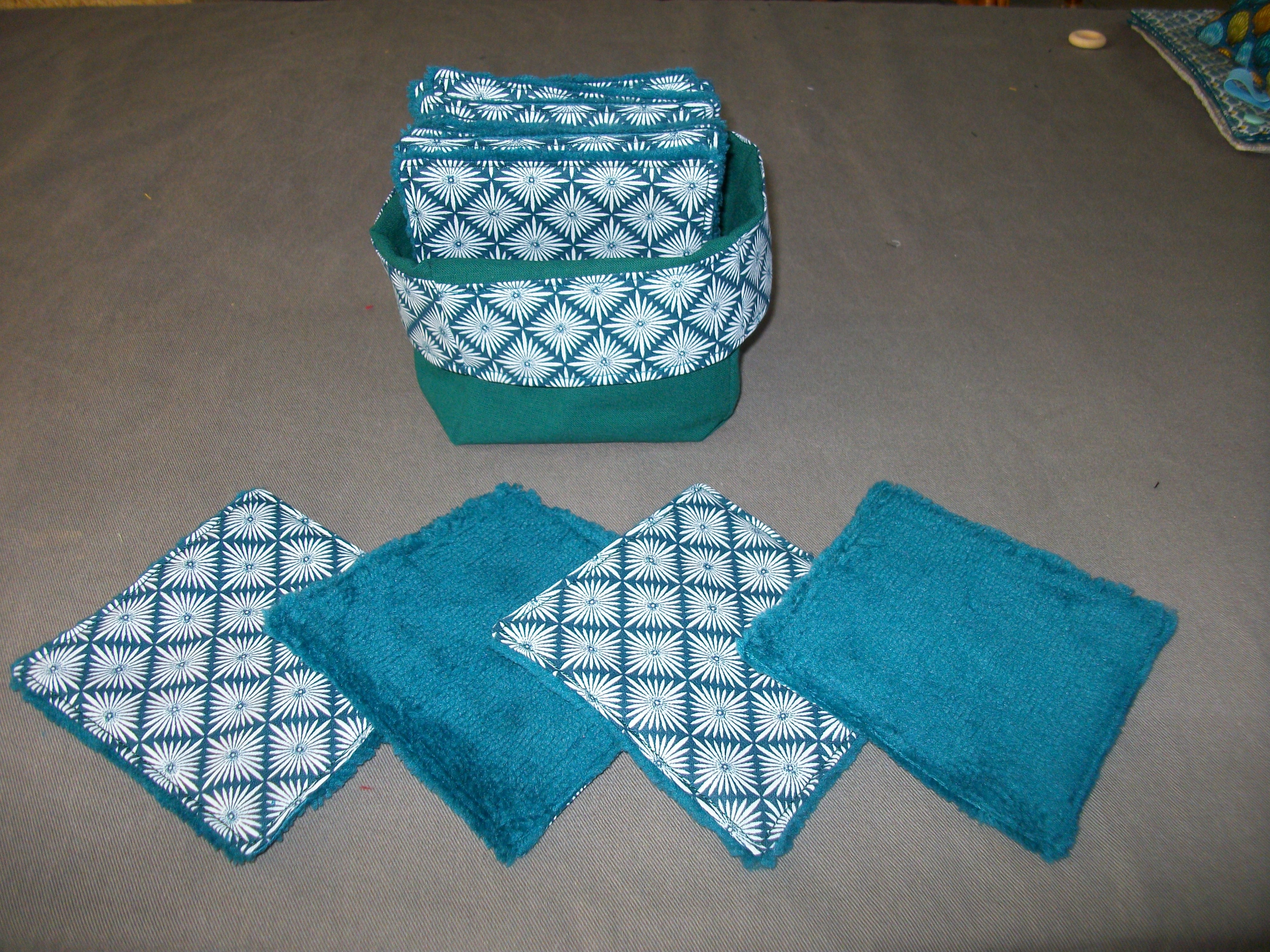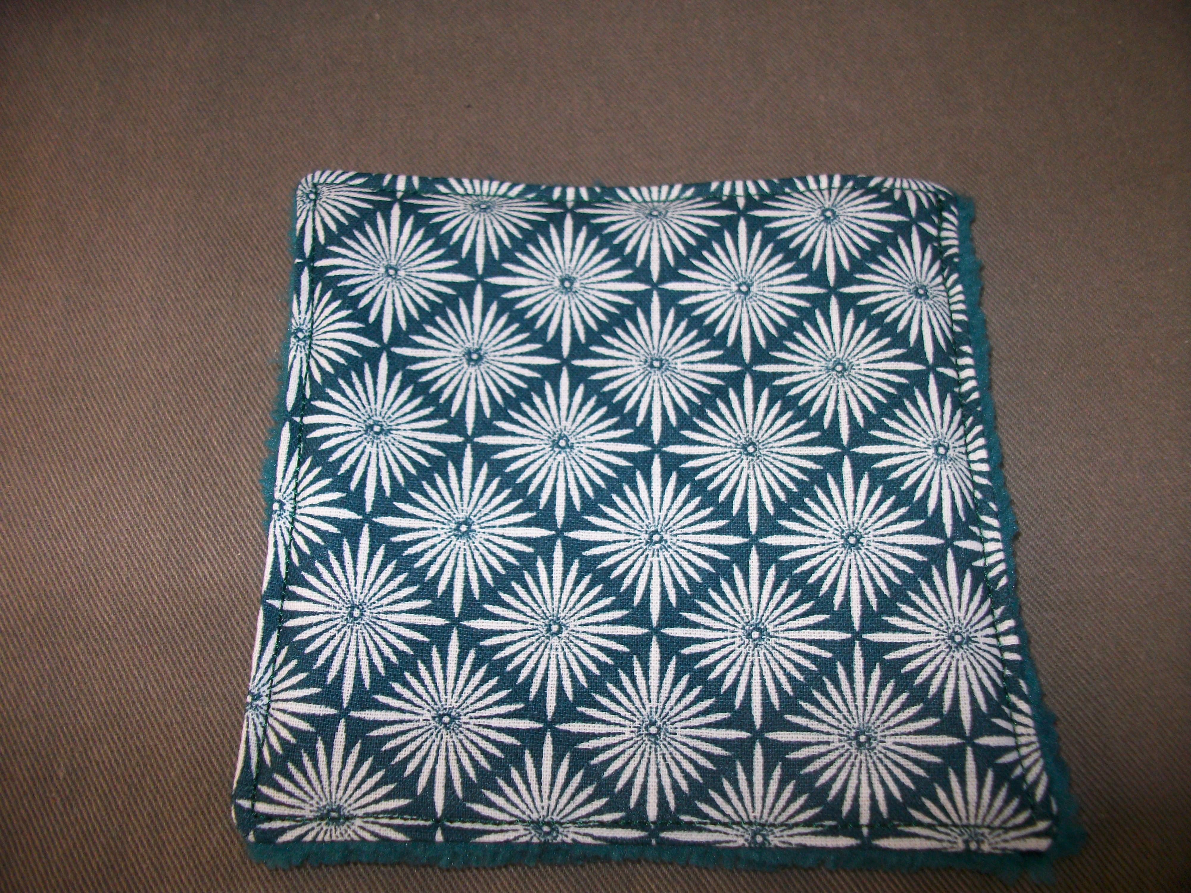 éponges coordonnées (rembourrage en tissu coton) une face tissu coton OEKO-TEX, une face tissu éponge nid d'abeille noire (très absorbant) dimension : 9x13,5 cm, très pratique pour essuyer la table, nettoyer la salle de bain car non abrasif, respect les surfaces fragiles, elles sont lavables et réutilisables.